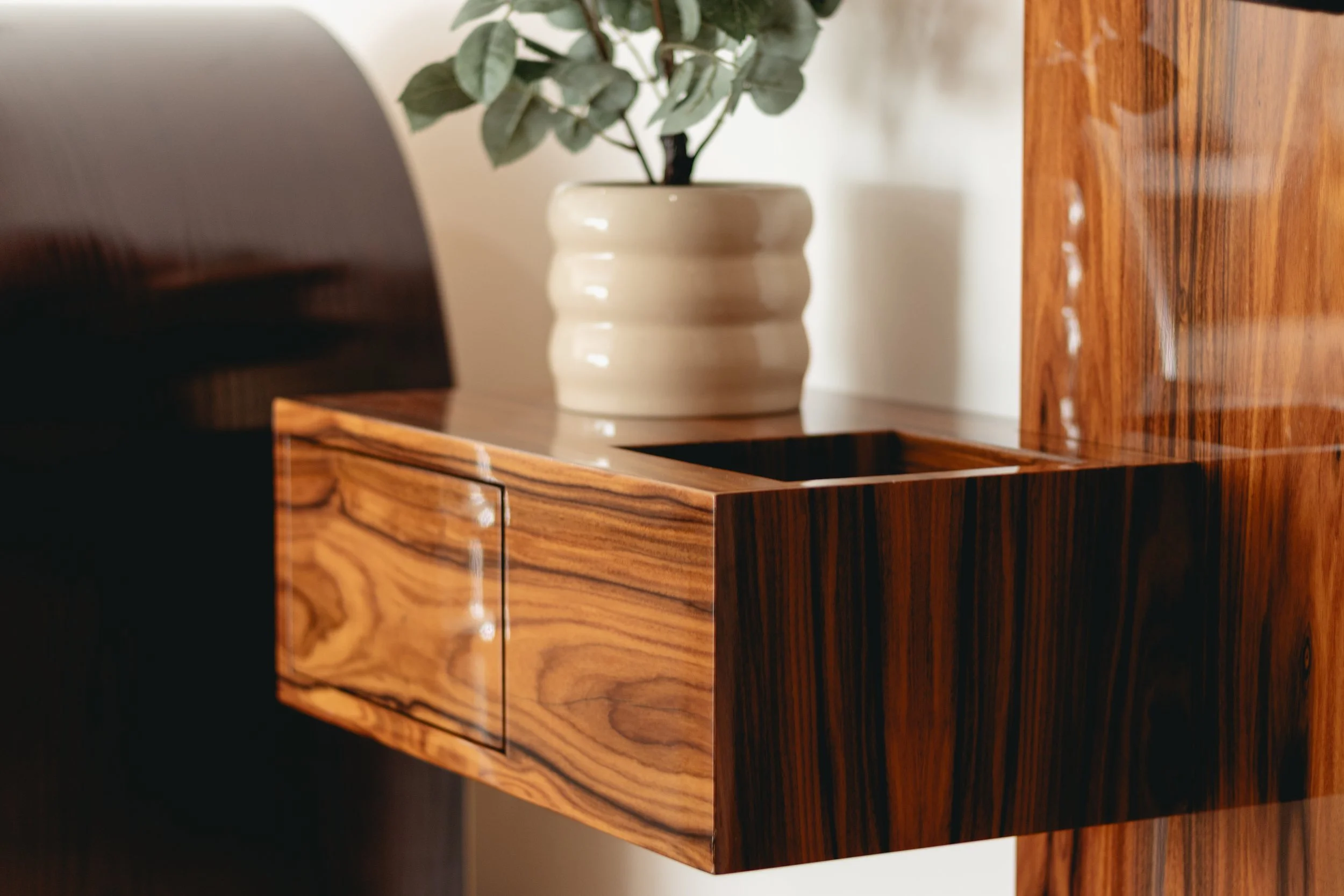 Já na suíte, foi concebido um quarto simples mas nobre, refletindo a imagem do utilizador. A simplicidade do design é completada pelos tons escuros da madeira, e pelo grande painel espelhado, que dá uma maior profundidade ao quarto destacando-o do resto da habitação.