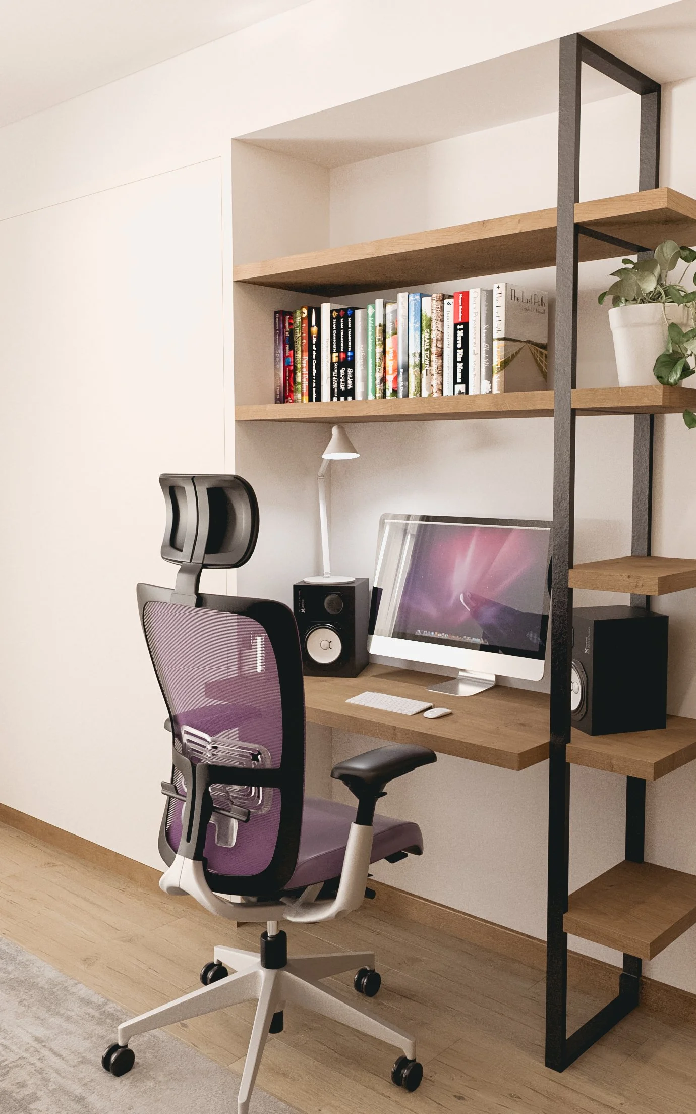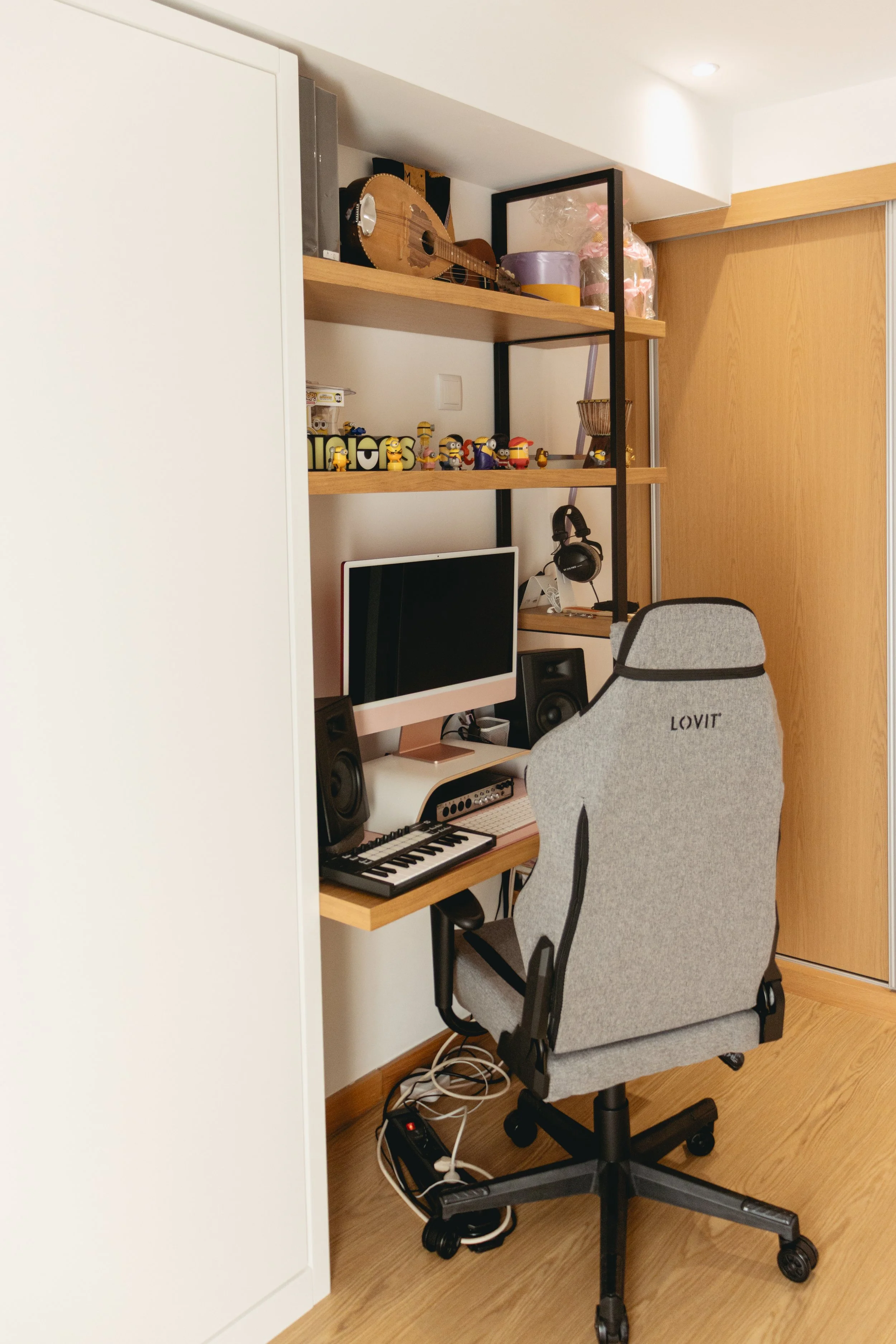 Já no estúdio, foi criada uma zona mista, onde um quarto extra, se transforma num escritório, proporcionando também um espaço amplo para que seja possível realizar as várias tarefas domésticas numa zona privada.